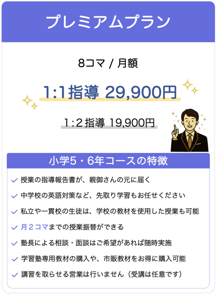 中学校での学習にスムーズにつながるよう、希望される方には英語・数学を中心とした先取り学習を行います。ただし、今の学年の内容がしっかり身についていることが前提です。まずは目の前の学習を確実に理解し、その上で中学内容にチャレンジしていく——そんな段階的なステップアップを大切にしています。