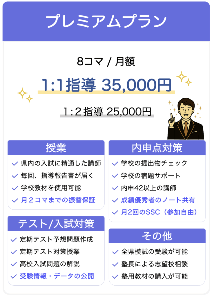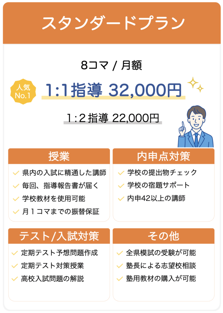 中学3年生コース 生徒一人ひとりの志望校・目標に合わせて、学力や内申点をUP! LINEで問い合わせる 受験生なのに、何から始めていいか分からない… 中学3年生になっても、「うちの子、本当に受験生なのかな」と感じることはありませんか?周りの中学生が動き始める中で、本人はまだどこか他人事のよう。でも、ただやる気がないだけなのでしょうか?実は、何から始めたらいいか分からず動けないのかもしれません。ThinkWithでは、何をやるべきか?を明確にし、迷いの中にいるお子さんに、寄り添うサポートを大切にしています。 中学3年生のつまずきPOINT 志望校が決まらず勉強に身が入らない 受験勉強と定期テストの両立が難しい スマホや気分の波に流されてしまう "いま何をすべきか"が明確になっていない 私立や一貫校の進度が早くて難しい 志望校や目標に合わせた、カリキュラム設定、教材決めを行うとともに、先生と「何をどのくらい勉強するべきか?」を一緒に考えていきましょう!ThinkWith個別塾では一人ひとりに合わせた授業を行います。 中学3年生コースの授業料 中学3年生コースの特徴 中学生の内申点対策に強い 内申点アップのために、定期テスト対策はもちろん、提出物チェックや学校の宿題サポートまで実施。月2回のスタディサポートクラス(SSC)で学校のワークやレポートを細かく確認します。 神奈川県の入試に特化 神奈川県の高校入試対策をメインとしているため、神奈川県出身の講師がメインです。講師自身が神奈川の公立高校入試や私立の推薦入試、併願入試を経験しているので、より具体的なアドバイスができます。 私立や中高一貫校の生徒が多い 私立の学校や、中高一貫校に通う生徒が全体の半数以上を占めます。学校のテキストやプリントを使った授業も行っており、難関校特有の先取り学習に対応しています。 定期テストを細かく分析 定期テストの点数UPのため、予想問題の作成。テスト対策授業、そしてテストの分析などを行います。おそらく、近隣のどの個別指導塾よりも細かく分析をします。 授業時間割 時間割 月〜土 1時間目:13:30-14:20 △ 2時間目:14:30-15:20 △ 3時間目:15:30-16:20 △ 4時間目:16:30-17:20 ○ 5時間目:17:30-18:20 ○ 6時間目:18:30-19:20 ○ 7時間目:19:30-20:20 ○ 8時間目:20:30-21:20 ○ ※ 1コマ = 50分+10分休憩※ 「△」は講習期や祝日のみ開講しています。※ 日曜日休講。 その他、お盆・年末年始などが休講日です。 中学3年生コースの料金 費用 料金 備考 入塾金 9,800円 教材費 6,000円/教科 年1回 授業料 32,000円/月 8コマ 維持管理費 1,600円/月 春期講習 32,000円 8コマ 夏期講習 64,000円 16コマ 冬期講習 48,000円 12コマ ※スタンダードプラン、1:1指導の場合※通常授業や季節講習のコマ数は、生徒によって異なります 中学3年生 よくあるご質問 内申点対策に力を入れていると聞いたのですが… はい、内申点対策に非常に力を入れています。定期テストはもちろんのこと、日頃の学校の提出物なども、持ってきていただければチェックしますし、夏期講習などでは、学校の課題(弁論や自由研究など)を手伝うことも多々あります。内申点を上げて、志望校合格を目指したいですね。 私立や中高一貫校の生徒が多いのですか? ThinkWith個別塾は個別指導塾では珍しく、私立や中高一貫校に通う生徒が全体の半数以上を占めています。こういった学校に通っている生徒は、塾の教材ではなく、学校の教材を使用して授業を進めていくことも可能です。 テスト対策はありますか? はい、ございます。通常授業の中で定期テスト範囲をしっかりカバーします。また、学校ごとに定期テストの予想問題をお渡しします。テスト直前には個別の対策プランもご提案します。 模試は受けられますか? はい。県内最大級の学力判定模試である神奈川全県模試が受けられます。 高校受験に詳しくないのですが・・・ 塾長との志望校相談が可能です。公立・私立問わず、また神奈川県の学校も、東京の学校もお聞きください。 まずは体験授業を無料でお試しください!ご相談やご質問もお気軽に! LINEで問い合わせる